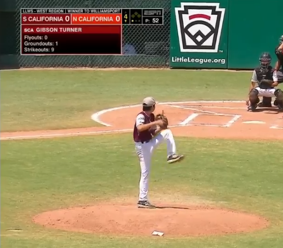 (SoCal’s Gibson Turner pitches against NorCal, Aug. 13. Photo courtesy of ESPN.)