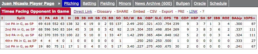 This is how Juan Nicasio does each time through an opposing lineup. The first time through, hitters slash .250/.321/.433; Nicasio shows a 22.3% strikeout rate and 8.9% walk rate. Those aren’t Cy Young Award-worthy stats, but it’s respectable enough.
