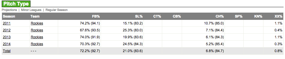 And this is Juan Nicasio’s pitch selection. He basically throws two pitches: a fastball 72.2% of the time that averages 92.7 MPH, and an 83.6 MPH slider he throws 21% of the time. He’s shown a changeup in the past, but its use declined to just 5.2% in 2014. As a reliever, he should scrap it except in certain situations against left-handed hitters.