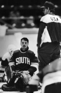 Playing for Team USA at the 1988 Winter Games in Calgary, Blue shared the goaltending duties with a future NHL all-star, but one who, unlike Blue, grew up in more of a hockey-friendly environment.