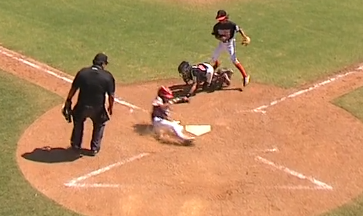 (Xavier Navarro scores Southern California’s winning run on a passed ball in the ninth inning, Aug. 10. Photo courtesy of ESPN.)