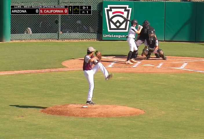 (Southern California’s Gibson Turner pitches to Arizona’s Gunner Brewer, to start the West tournament, Aug. 8. Photo courtesy of ESPN.)