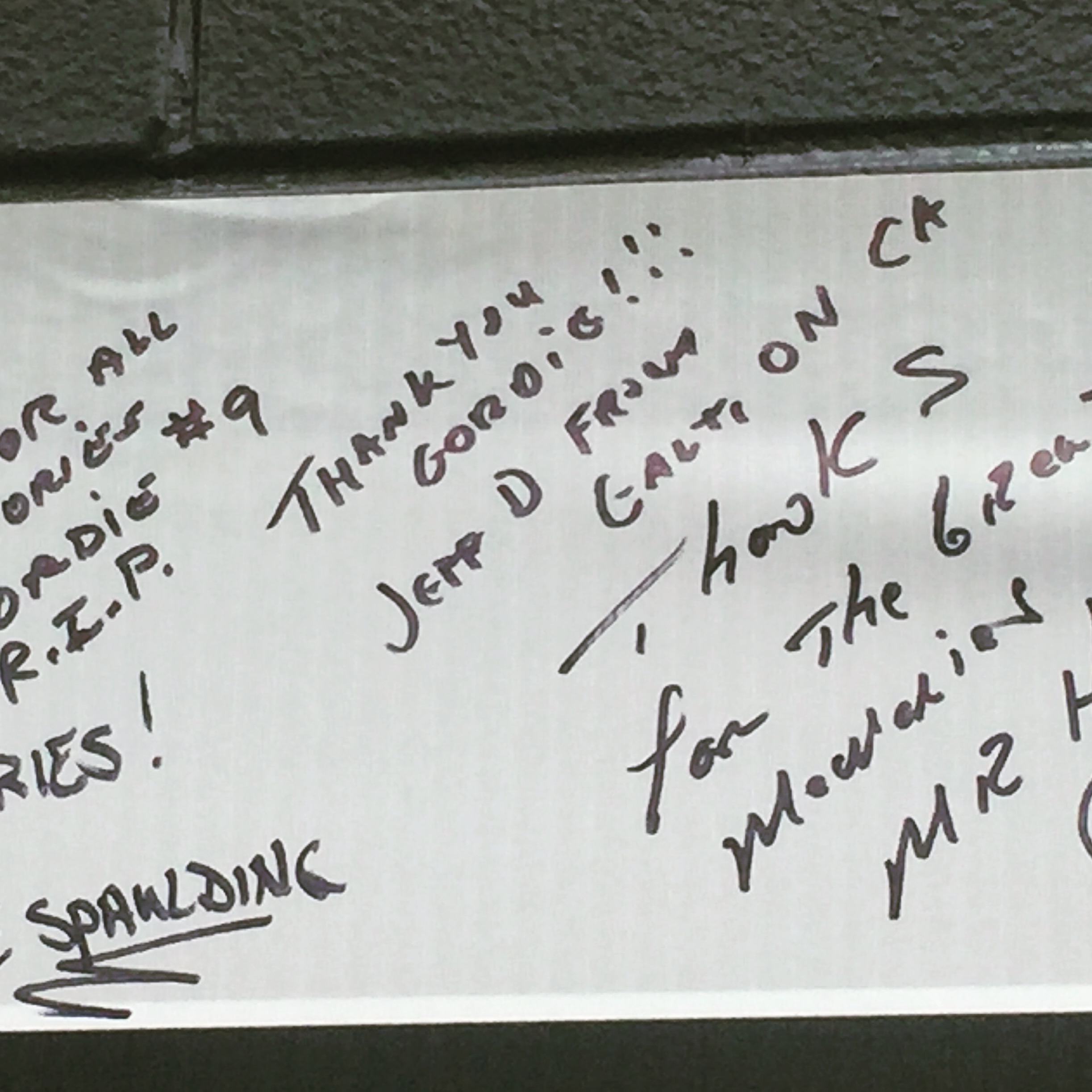 From what I could see and tell, I estimated that there was already thousands of signatures on those posters, with still thousands of more fans still to come. A staff member of the arena handed me a marker and found a spot on the wall for me so I could write my name down.  I did but just before I wrote Cambridge on it, I decided to write the name that Gordie was more familiar with.