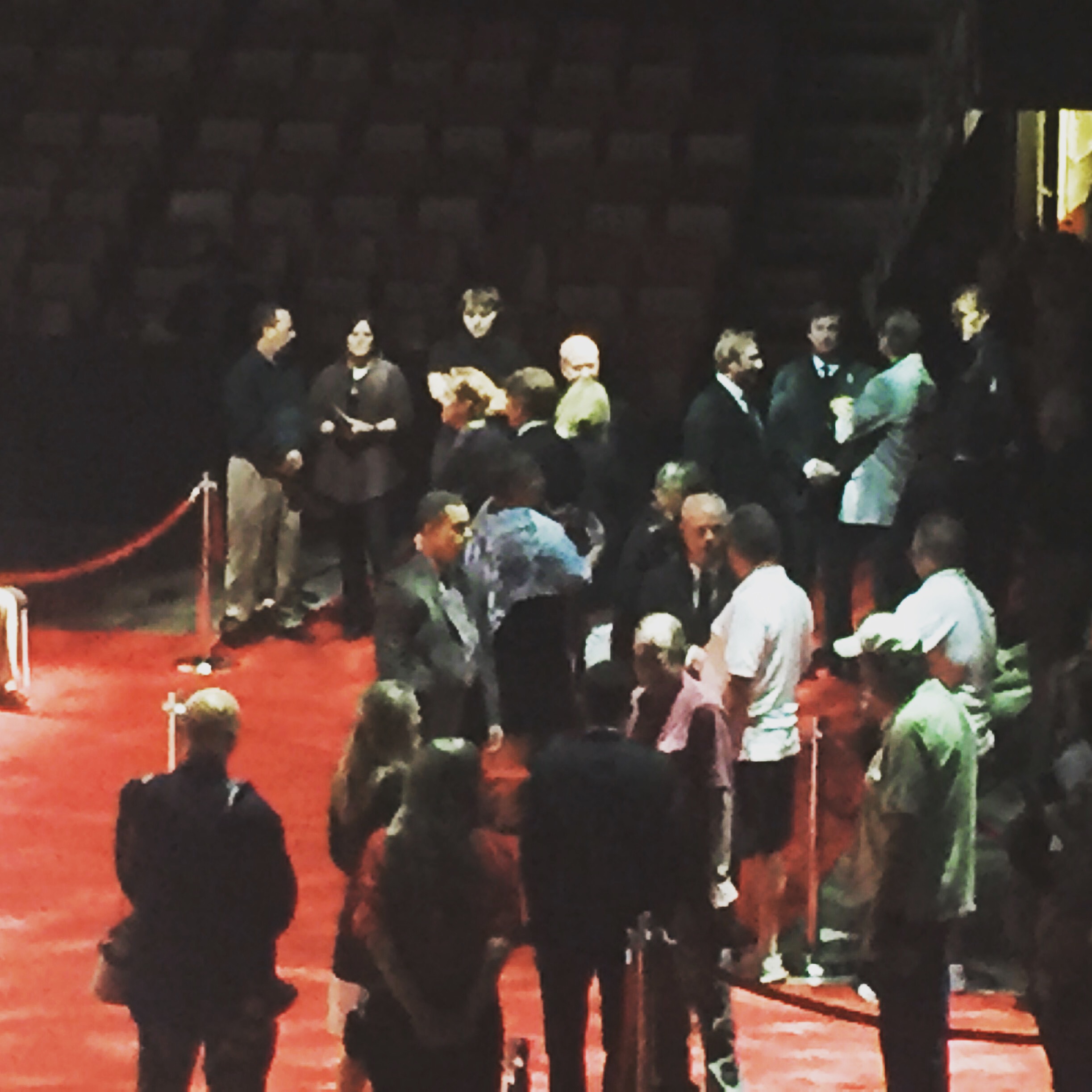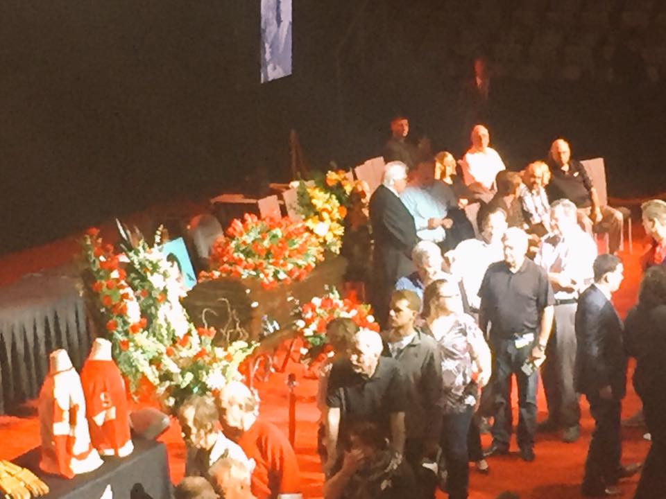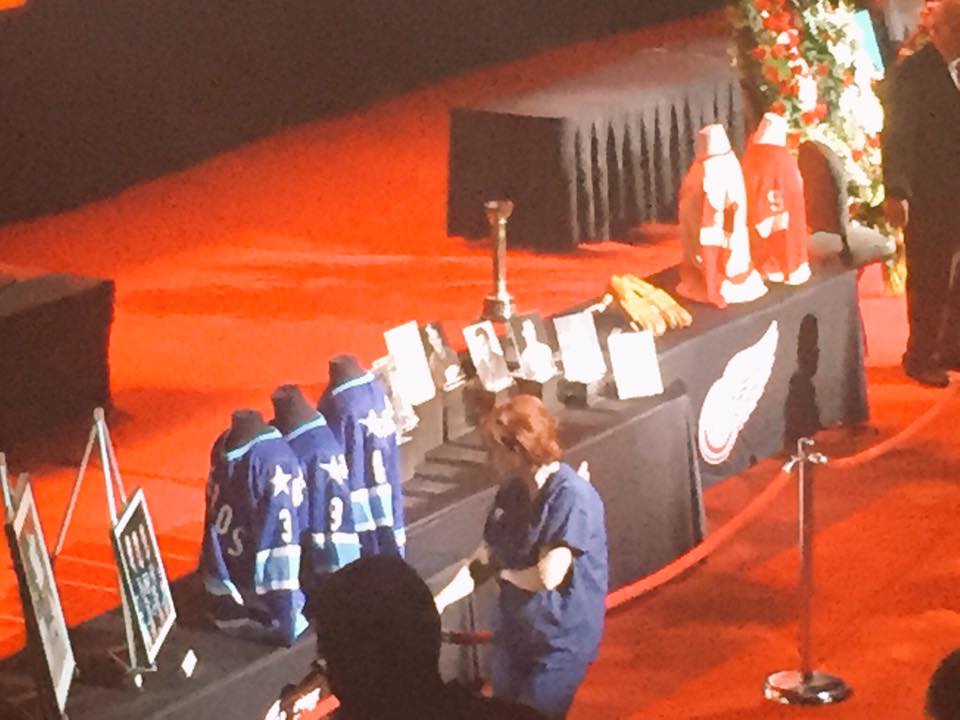 I got in line with hundreds of other fans and entered a side entrance into the arena. Before I knew it, I was on the ice, (but without the actual ice as they took the ice out for the summer). We were only allowed to take photos from afar and nowhere near the casket which was more than fine and something everyone respected.  Slowly we walked up the where Mr. Hockey was laying and I shook the hands of his sons Murray and Mark, who were greeting and thanking everyone for attending.