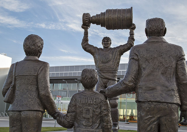 (Statues of an adult Wayne Gretzky with the Stanley Cup while facing statues of his parents and his child self in Brantford, ON. Do you notice who’s jersey the young Gretzky is wearing?)