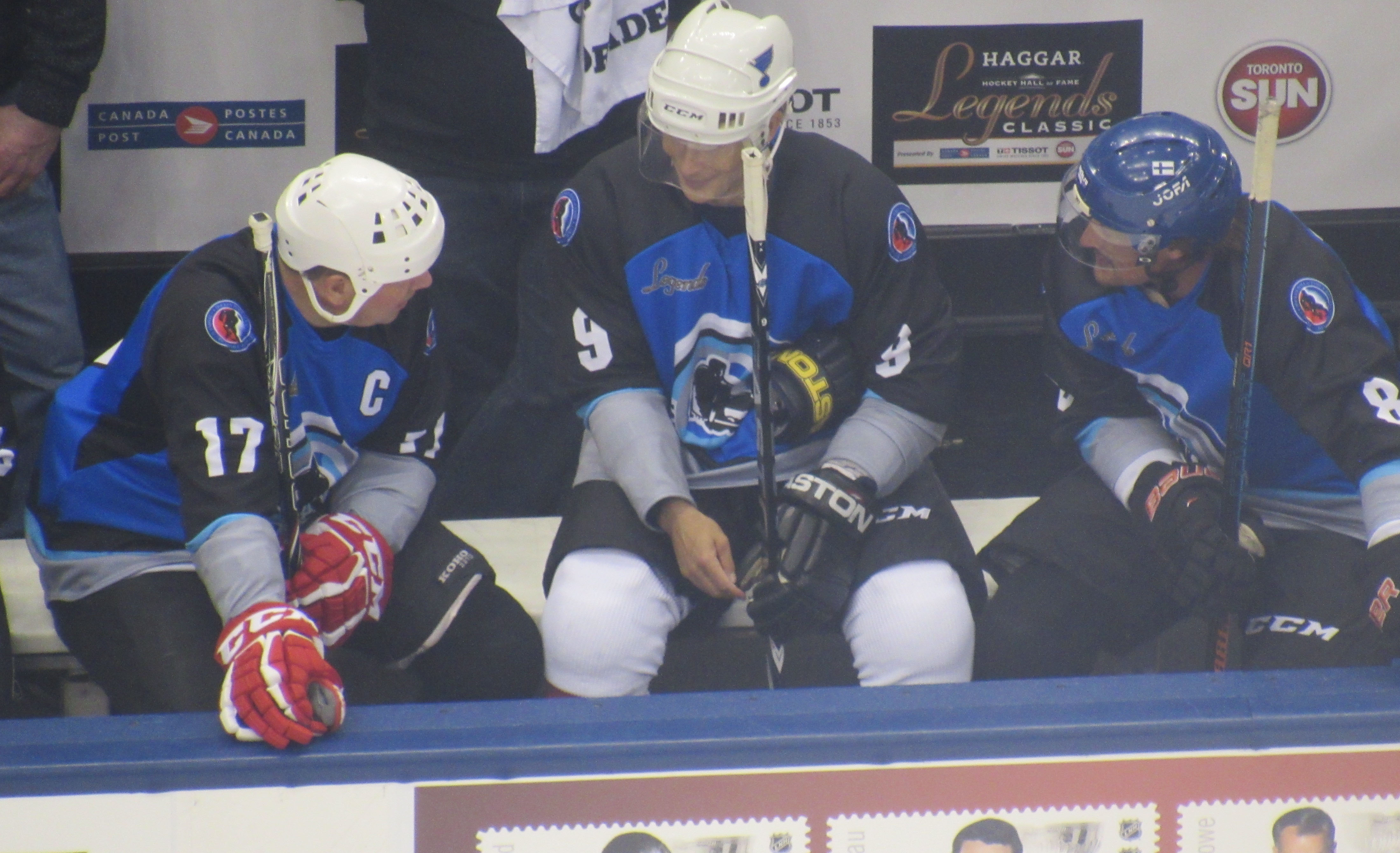 (Kurri talking strategy with 2017 Hall of Fame Inductees Paul Kariya & Teemu Selanne at the Hall of Fame Legends Game in Toronto)