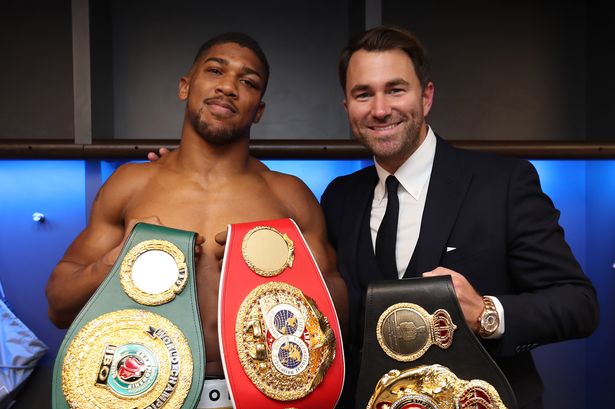 (World Champion Anthony “AJ” Joshua with manager and boxing promoter, Don Kin… I mean Eddie Hearn. Photo – boxingscene)